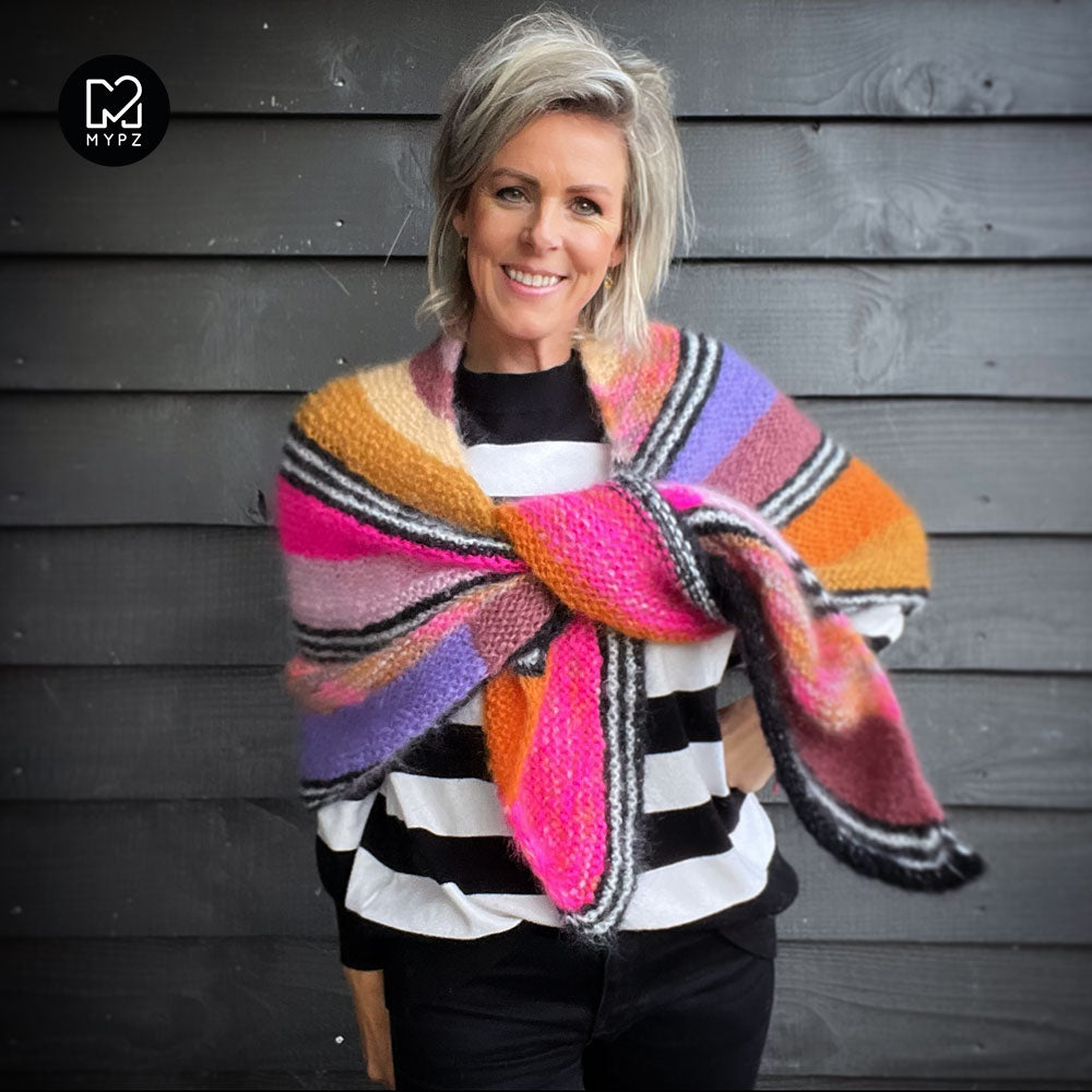This soft warm shawl is a pleasure to wear and lightweight. This kit contains MYPZ Chunky Kidmohair DK, a high quality fine brushed mohair that does not pill.
